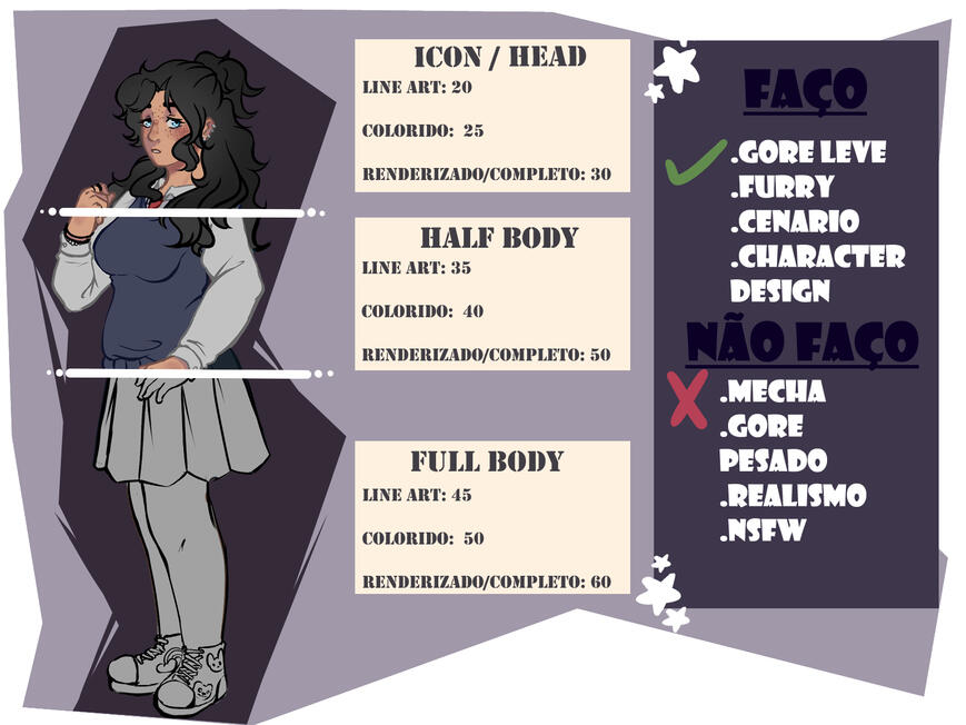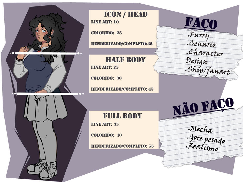 Termos>Não permito minha arte ou peças serem usadas para NFT ou IA>a adicão de personagem ou cenário tem um aumento de 15 reais no valor total.>No momento estou apenas aceitando pagamentos em pix>Dou prazo e 2 semanas para entregar a sua arte>Irei postar as encomendas que produzo, caso não queira que divulgue a sua por favor avise>A encomenda será enviada em um arquivo por E-mail para melhor resolução>Não vou tolerar nenhum tipo de desrespeito ou chantagem durante a conversa>Por favor envie o máximo de referencias e inspirações possível para que o produto final fique do seu agrado>Sobre reembolsos, fique a vontade se quiser cancelar seu pedido mas dependendo do quão avança estiver o processo 10% do valor já enviado não será estornado.